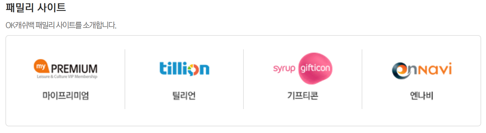 5. 패밀리 사이트는 마이프리미엄, 틸리언, 기프티콘, 엔나비 등 4곳이 소개되어 있었습니다.
