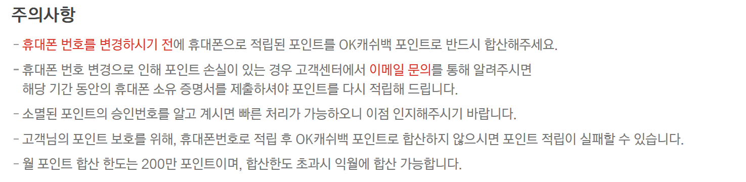 8. 주의사항으로는 휴대폰 번호 변경 전 반드시 ok캐쉬백으로 합산해야 하며 만약 이미 바꾼 경우에는 이메일로 문의 할 수 있습니다. 월 합산 한도는 200만 point 이며 초과 시에는 익월로 합산이 됩니다.