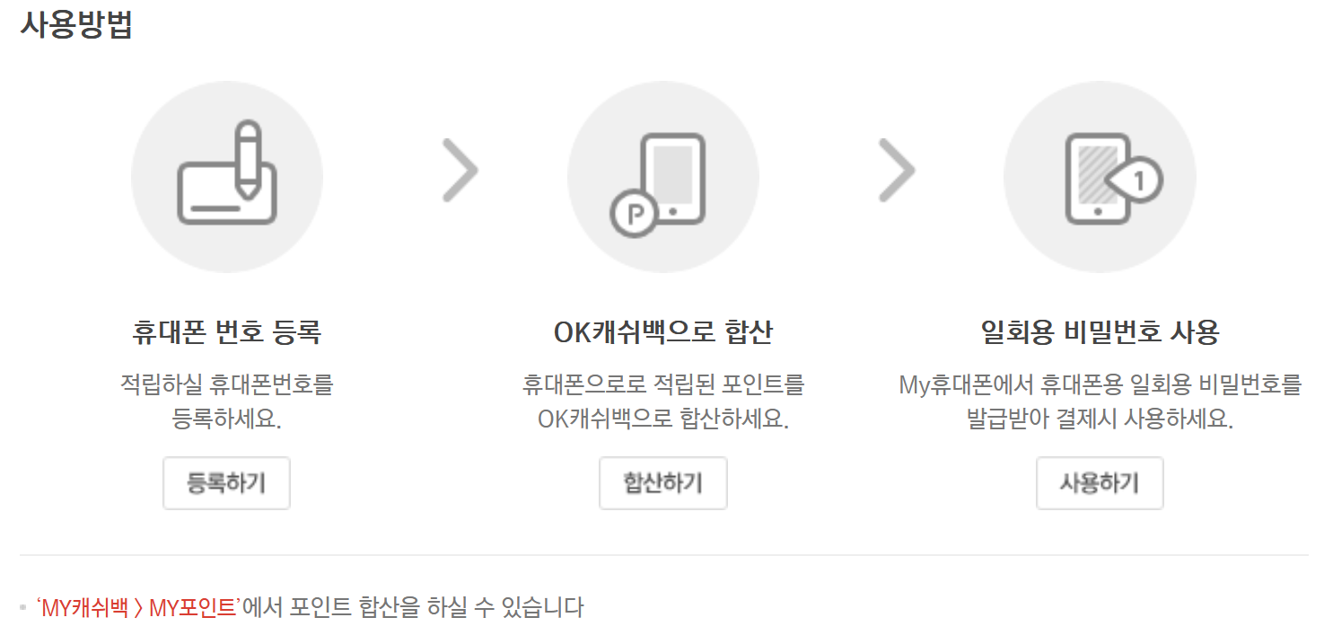 7. 사용법은 휴대폰번호 등록->ok캐쉬백 합산->일회용 비밀번호를 사용하여 결제 시 사용 할 수 있습니다.
