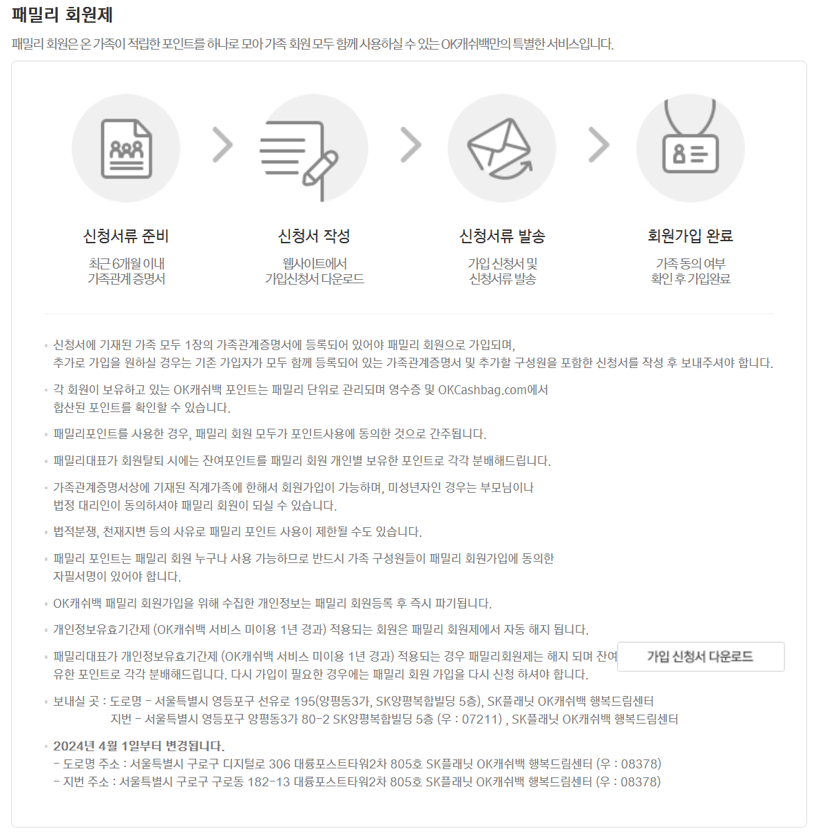 4. 패밀리 회원제는 온가족이 적립한 포인트를 하나로 사용 할 수 있는 틀별한 서비스이며 신청서류를 준비해서 작성하고 가입하면 패밀리로 묶어집니다.