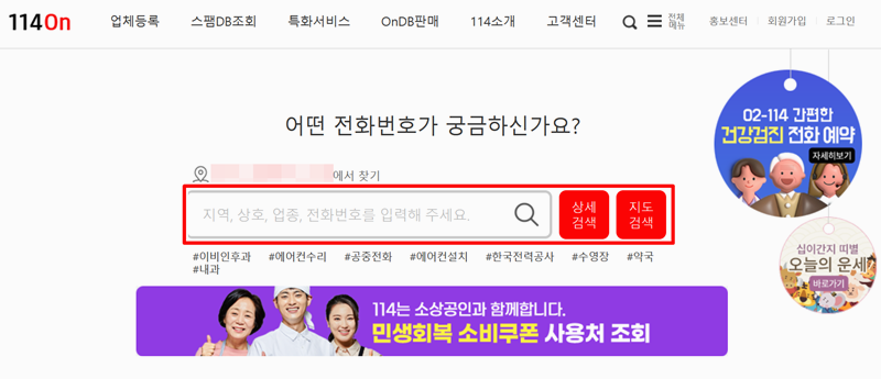 1. 홈페이지에 있는 검색창에 알고 있는 상호나 전화번호를 기입해 주세요. 지역, 업종 등 아는 정보를 함께 넣으면 더 정확한 결과를 얻을 수 있어요. 정보를 다 넣었다면 옆에 있는 '상세 검색'이나 '지도 검색'을 통해 찾아봅니다.
