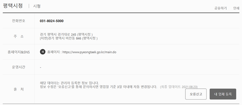 3. 목록에서 원하는 항목을 선택하면 더 상세한 정보를 볼 수 있습니다. '평택시청'의 예시처럼 전화번호, 도로명 주소와 지번 주소, 그리고 공식 홈페이지 주소까지 자세하게 안내되어 있어 필요한 정보를 한눈에 파악하기 편리합니다.