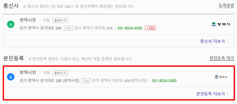 2. 검색을 마치면 '평택시청'과 같이 해당 번호와 관련된 장소의 목록이 나타납니다. 결과는 통신사에서 받은 정보와 운영자가 직접 기입한 정보로 나뉘어 보일 수 있어요. 두 정보 모두 주소, 연락처 등을 포함하고 있으니 확인해 주세요.