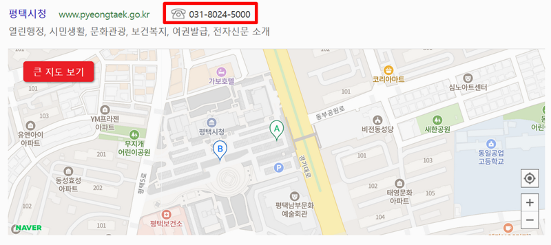4. 번호 검색이 완료되면 '평택시청'의 경우처럼 지도 위에 해당 위치가 표시됩니다. 이와 함께 정확한 주소와 연락처, 관련 웹사이트 정보가 함께 나타나므로, 위치를 시각적으로 바로 확인하고 찾아갈 때 큰 도움이 됩니다.