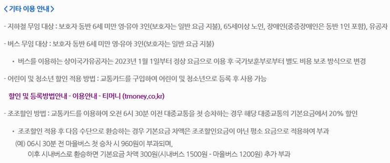 4. 표 아래에는 기타 이용 안내 사항이 있습니다. 만 6세 미만 영유아 무임승차 기준이나 조조할인에 대한 내용이 담겨있죠. 오전 6시 30분 이전에 첫 대중교통을 이용하면 기본요금의 20%를 할인받을 수 있다는 점을 확인할 수 있습니다.
