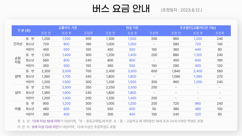 3. 먼저 버스 요금 안내표를 통해 현재 요금을 확인할 수 있어요. 가장 흔히 이용하는 간선·지선버스의 경우 교통카드 기준으로 일반 1,500원, 청소년 900원, 어린이 550원의 요금이 적용되고 있답니다. 이 요금은 2023년 8월 12일부터 조정된 것으로, 순환버스, 광역버스 등 다른 종류의 버스 요금도 함께 찾아볼 수 있습니다.