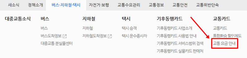 2. '버스·지하철·택시' 페이지로 이동하면 대중교통 소식, 버스, 지하철 등 세부 분류가 보입니다. 오른쪽의 '교통카드' 분류 아래에 있는 '교통 요금 안내'로 들어가면 현재 적용되는 요금 정보를 살펴볼 수 있습니다.