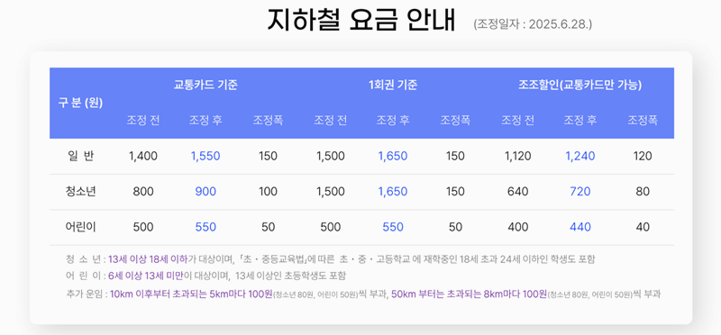 6. 버스 요금 외에 지하철 요금 안내표도 찾아볼 수 있습니다. 일반, 청소년, 어린이 요금이 교통카드와 1회권 기준으로 나누어져 있으며, 10km 초과 시 거리 비례 추가 운임이 어떻게 부과되는지에 대한 설명도 함께 나와 있습니다.