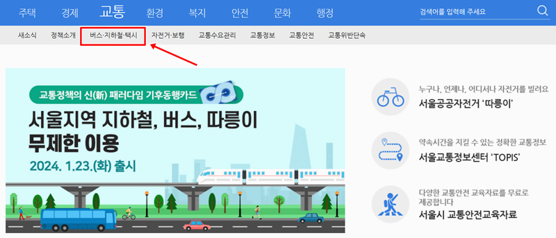1. 상단 메뉴에서 '교통'을 선택하면 여러 하위 항목이 나타납니다. 여기서 버스, 지하철, 택시와 관련된 정보를 모아둔 '버스·지하철·택시' 항목을 찾아 들어가면 다양한 교통 정책과 소식을 확인할 수 있습니다.