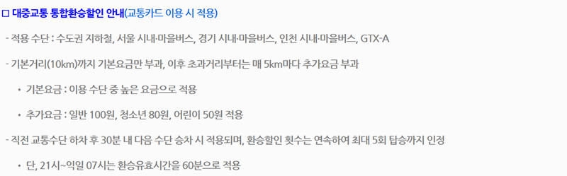 5. 이어서 대중교통 통합환승할인에 대한 안내를 볼 수 있습니다. 수도권 내 대중교통 이용 시 기본거리 10km까지는 기본요금만 부과되고, 이후 5km마다 추가 요금이 붙는 방식입니다. 환승은 하차 후 30분 이내에 해야 적용됩니다.