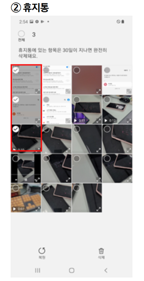 3. 휴지통에 들어오면 그동안 삭제했던 미디어 파일 목록이 보일 거예요. 여기서 영구적으로 없애고 싶은 항목을 길게 눌러주세요. 그러면 선택 모드로 바뀌면서 여러 항목을 동시에 고를 수 있게 됩니다. 화면처럼 체크 표시가 나타나면 제대로 선택된 것이에요.