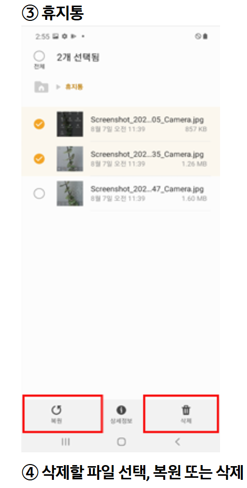 8. 정리하고 싶은 파일들을 선택하면 화면 아래에 '복원'과 '삭제'가 나타납니다. 갤러리에서와 동일하게, 파일을 원래 위치로 되돌리고 싶다면 '복원'을, 완전히 제거하여 공간을 확보하려면 '삭제'를 눌러주세요. 이렇게 하면 숨겨진 파일까지 깔끔하게 정리할 수 있습니다.