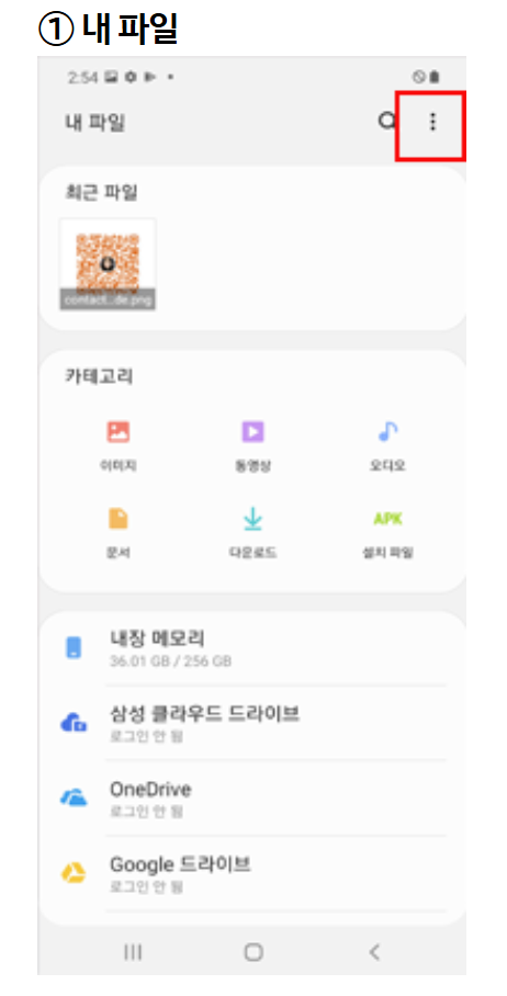 6. '내 파일' 앱의 메인 화면이 나타나면, 갤러리와 마찬가지로 오른쪽 상단에 위치한 점 3개 모양의 '더보기' 메뉴를 눌러주세요. 이곳에는 최근 파일 목록을 지우거나 저장공간을 분석하는 등 파일 관리에 도움이 되는 여러 기능들이 모여 있습니다.