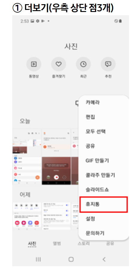 2. '더보기'를 누르면 여러 메뉴가 나타나는데, 그중에서 '휴지통'이라는 항목을 찾아 선택해 주세요. 우리가 삭제했던 사진이나 영상 파일들은 바로 사라지지 않고, 일정 기간 동안 이곳에 보관됩니다. 실수로 지운 파일을 되살릴 수도 있는 유용한 공간이죠.