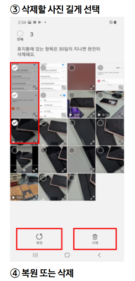 4. 정리할 사진과 영상을 모두 선택했다면, 이제 화면 아래쪽을 확인해 주세요. 왼쪽에는 '복원', 오른쪽에는 '삭제'가 나타납니다. 파일을 다시 갤러리로 되돌리고 싶다면 '복원'을, 완전히 없애 저장 공간을 확보하고 싶다면 '삭제'를 선택하면 모든 과정이 끝나요.