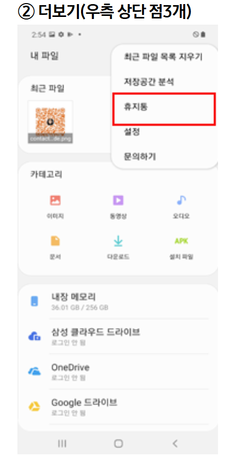 7. '더보기' 메뉴를 열면 여러 항목 중에서 '휴지통'을 발견할 수 있습니다. 이 부분을 선택해서 들어가면, 삭제했던 문서나 음악, 압축 파일 등 다양한 종류의 파일들이 보관되어 있는 것을 확인할 수 있습니다. 갤러리 휴지통과는 별개로 운영되는 공간이에요.