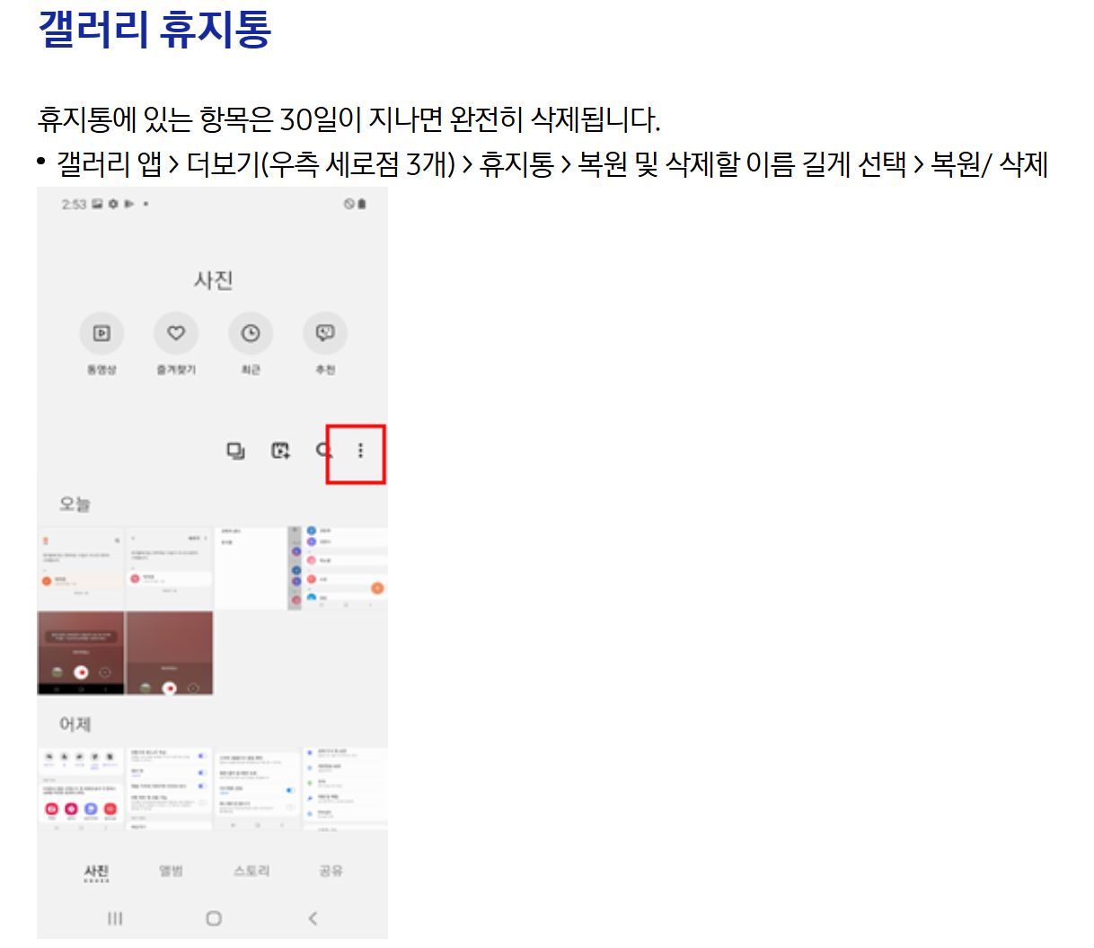 1. 먼저 갤러리 앱을 열어주세요. 화면 오른쪽 상단에 세로로 점 3개가 찍힌 '더보기' 메뉴가 보일 거예요. 사진첩의 여러 숨겨진 기능을 사용하려면 이 부분을 눌러주어야 합니다. 평소에 잘 사용하지 않았다면 어떤 기능들이 있는지 살펴보는 것도 좋은 경험이 될 수 있어요.