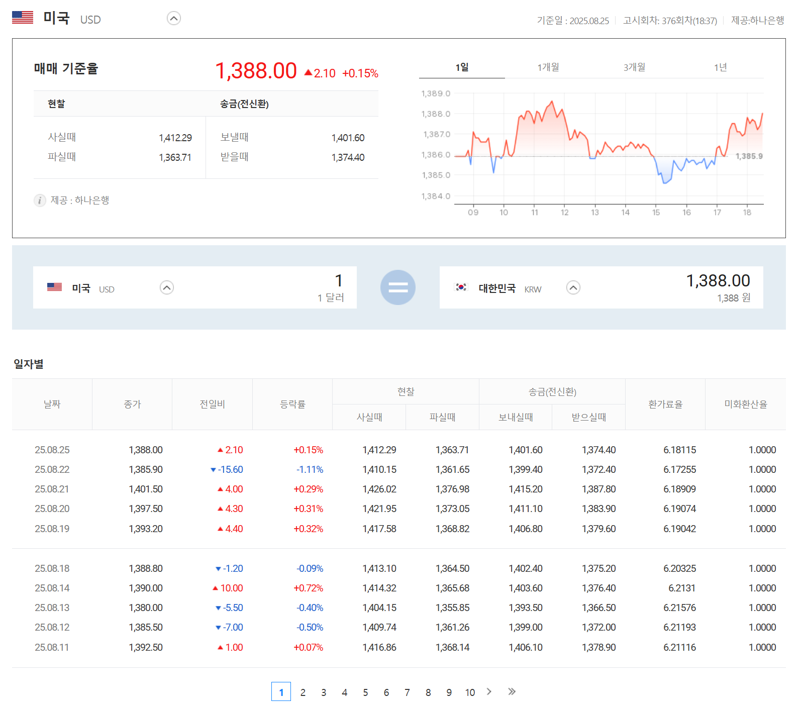6. 특정 국가를 선택하면 더욱 상세한 정보를 조회할 수 있습니다. 일별 시세 내역을 통해 지난 날짜들의 환율 변동 추이를 날짜별로 확인할 수 있고, 차트를 통해 1개월, 3개월, 1년 단위의 장기적인 흐름도 살펴볼 수 있습니다.