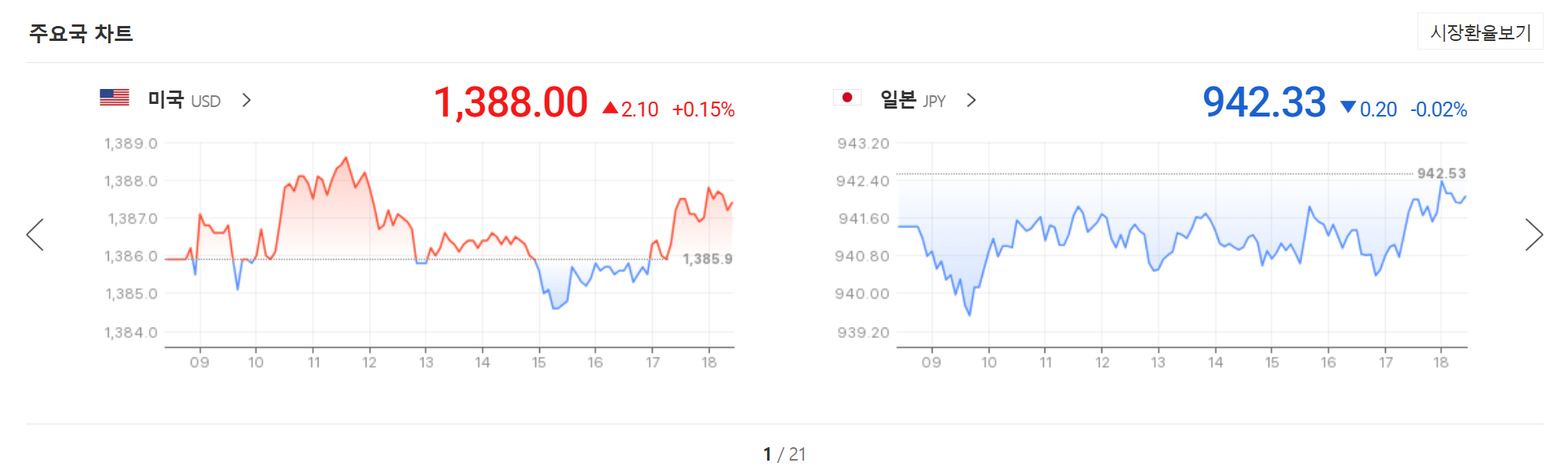 4. 주요국 차트 영역에서는 미국 달러와 일본 엔화의 시간대별 변동 추이를 그래프로 시각적으로 보여줍니다. 하루 동안의 흐름을 쉽게 파악할 수 있어서 언제 환율이 오르고 내렸는지 직관적으로 이해하는 데 도움이 됩니다.