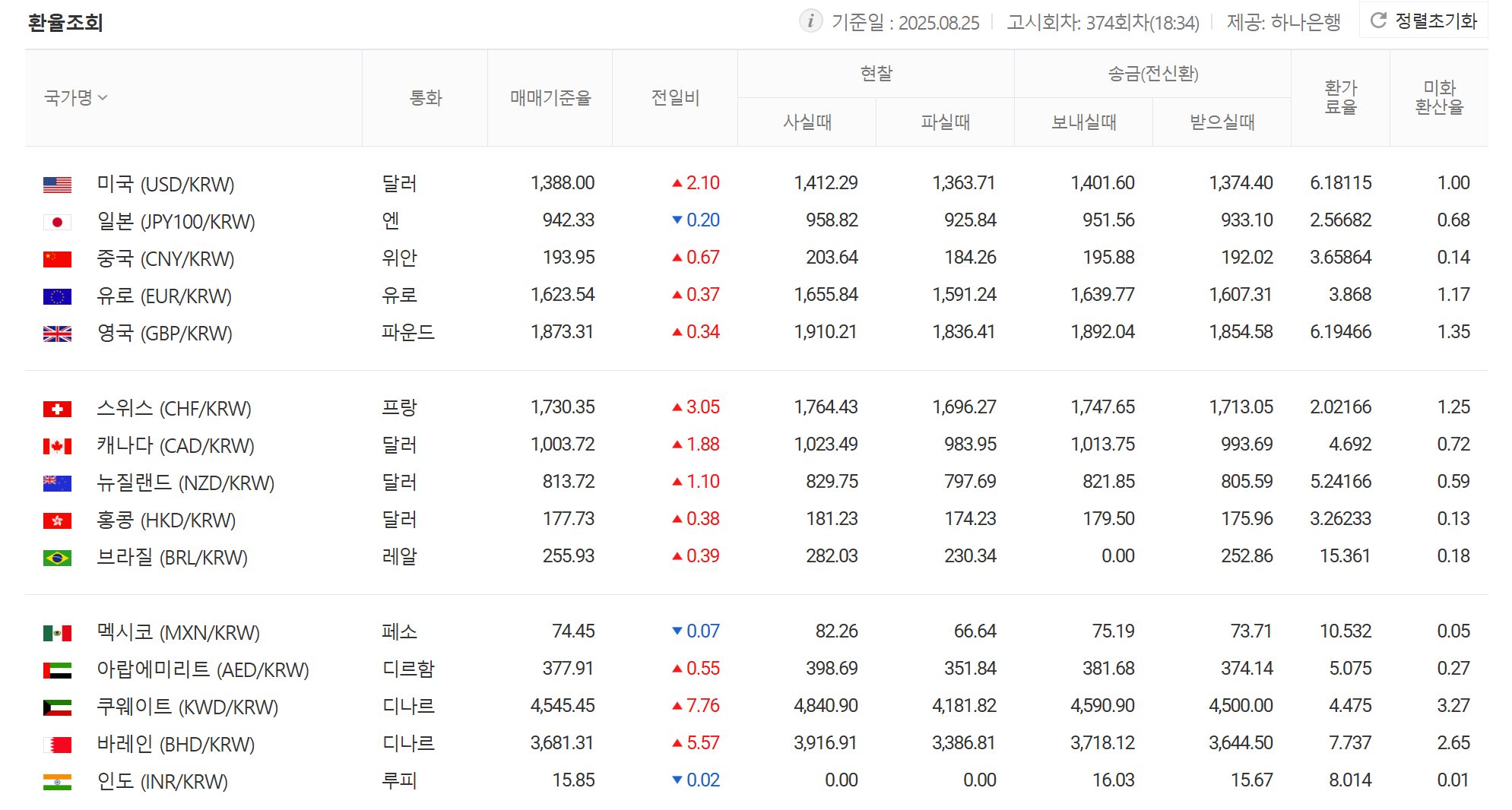 5. 더 아래로 내려가면 미국, 일본, 중국, 유럽연합 등 여러 국가의 환율 정보를 표로 일목요연하게 정리해 놓은 것을 볼 수 있습니다. 현재 기준가뿐만 아니라 현찰을 살 때와 팔 때, 송금을 보낼 때와 받을 때의 금액까지 상세하게 나타나 있습니다.
