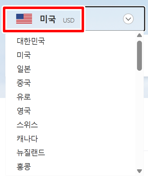 3. 미국 달러가 아닌 다른 나라의 통화가 궁금하다면 국기 그림이 있는 부분을 눌러 변경할 수 있습니다. 펼쳐지는 목록에서 대한민국, 미국, 일본, 중국, 유로 등 조회하고 싶은 국가를 자유롭게 고를 수 있어 활용도가 높습니다.