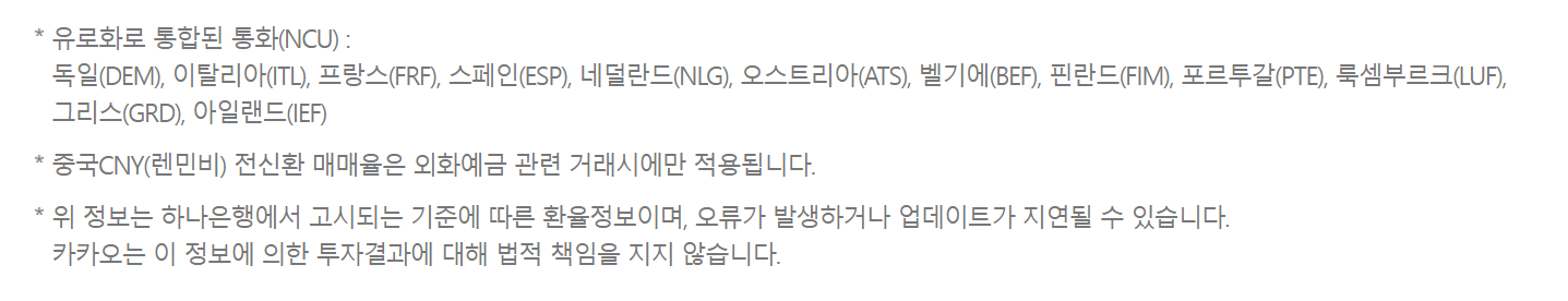 7. 페이지 가장 아래쪽에서는 참고할 만한 추가 안내 사항들을 확인할 수 있습니다. 유로화로 통합된 이전 통화들에 대한 정보나 중국 위안화 거래 시 참고사항, 그리고 해당 정보의 기준과 관련된 내용이 설명되어 있습니다.