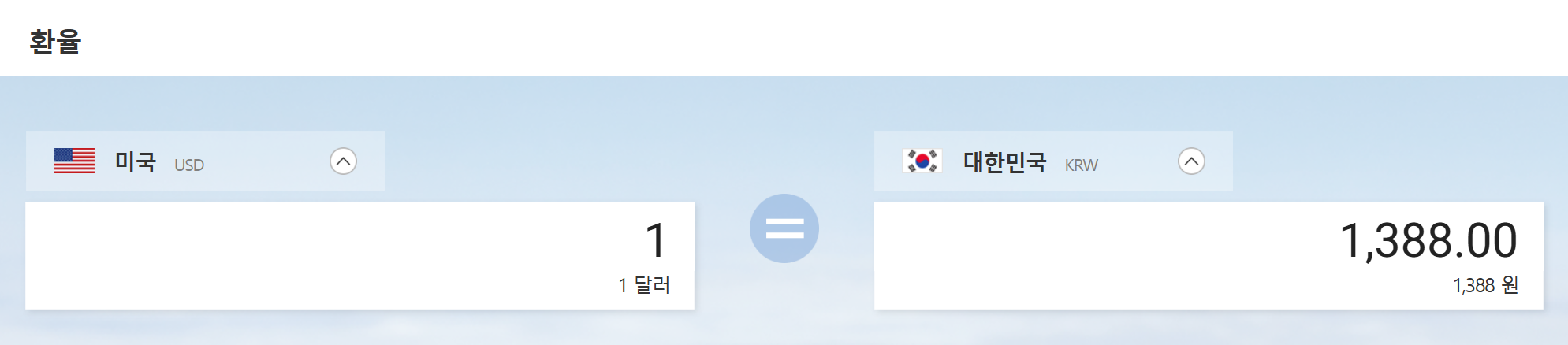 2. 환율 화면으로 넘어가면 기본적으로 미국 달러와 대한민국 원이 설정된 환율 계산기를 바로 마주하게 됩니다. 1달러가 현재 얼마의 가치를 지니는지 숫자로 명확하게 보여주기 때문에 한눈에 현재 시세를 파악하기 좋아요.