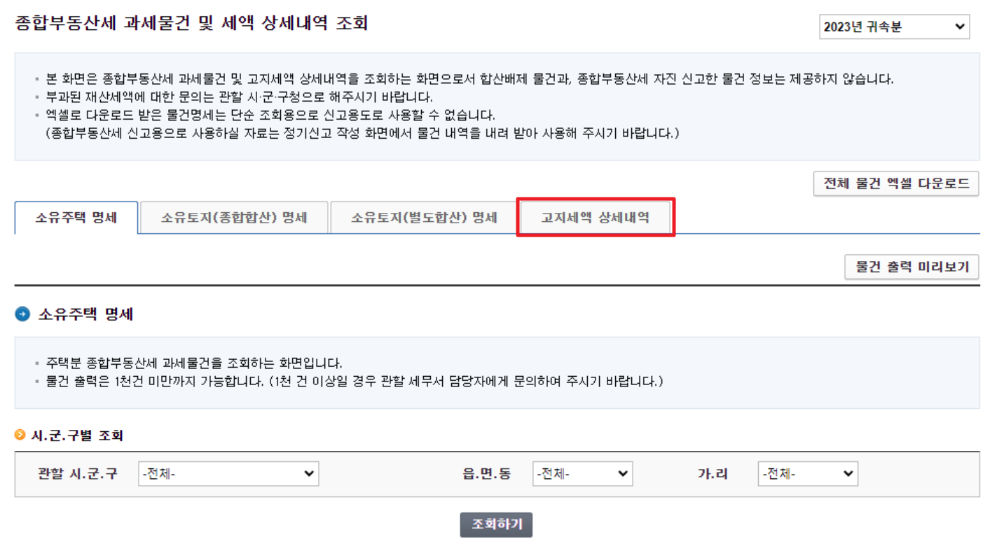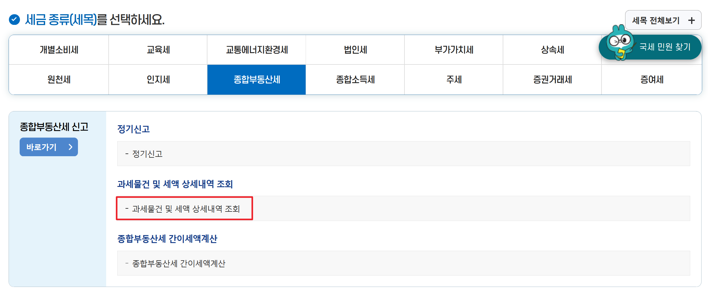 2. 그리고 종합부동산세를 선택하고 과세물건 및 세액 상세내역 조회로 들어갑니다.