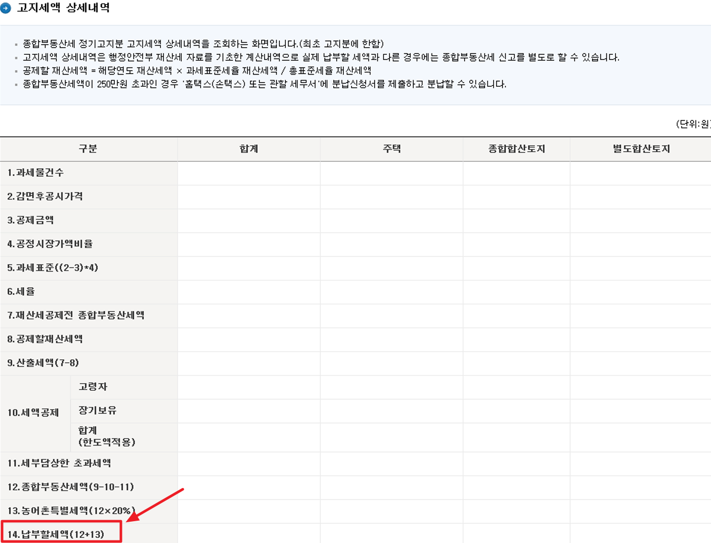 3. 소유주택 명세, 소유토지 명세 등의 카테고리가 있는데 여기서 고지세액 상세내역으로 이동합니다.
