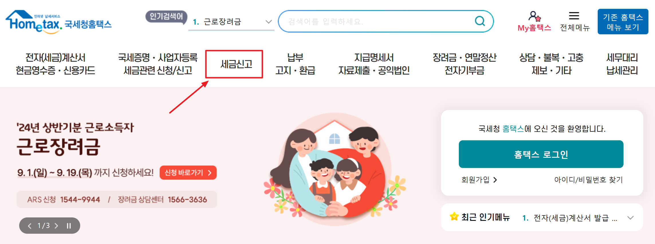 1. 국세청 홈택스로 방문한 뒤에 메뉴 중 세금신고로 들어갑니다.
