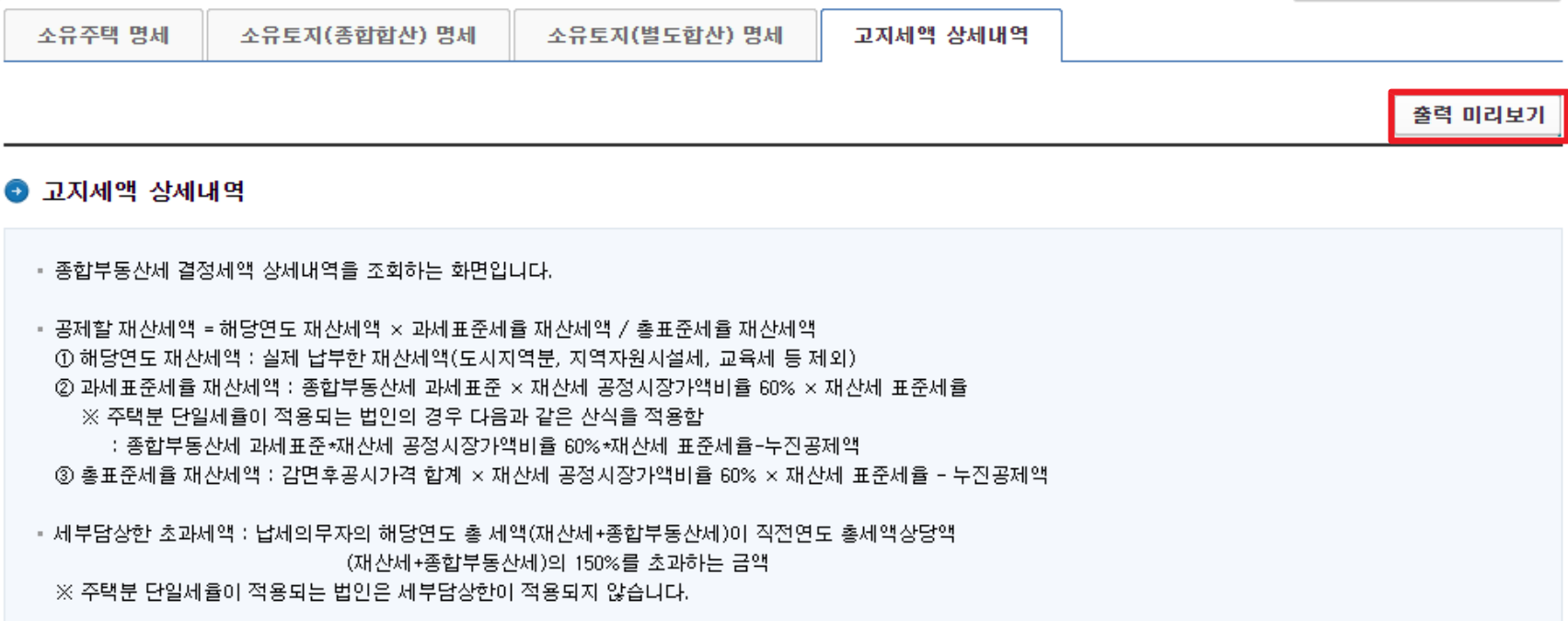 4. 고지세액 상세내역은 결정세액의 상세 내역을 알려주는 곳으로 스크롤을 내려줍니다. 출력 미리보기는 미리 출력할 결과물을 확인 할 수 있습니다.