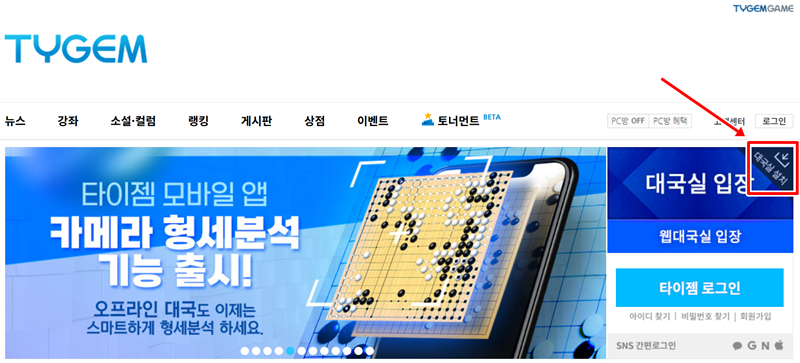 1. 홈페이지에 들어서면 오른쪽에 보이는 '대국실 설치'라는 문구를 통해 설치 파일을 내려받을 수 있습니다. 이곳을 통해 프로그램을 자신의 컴퓨터로 가져오는 첫 단계를 시작하게 됩니다.