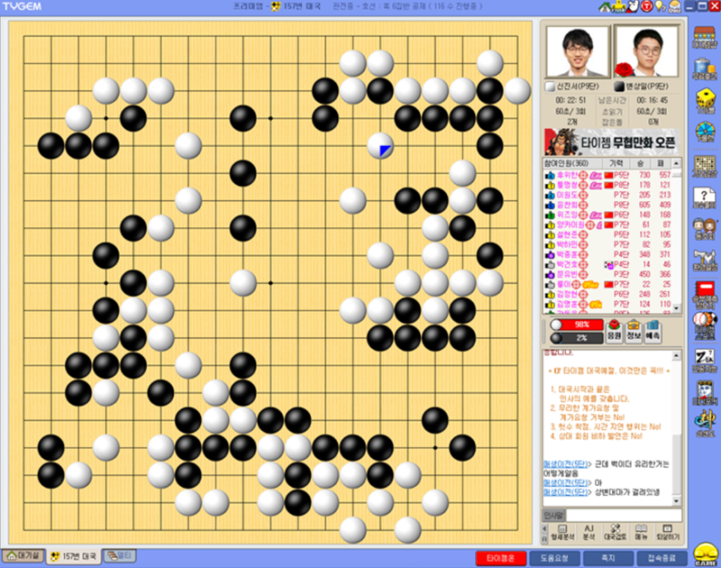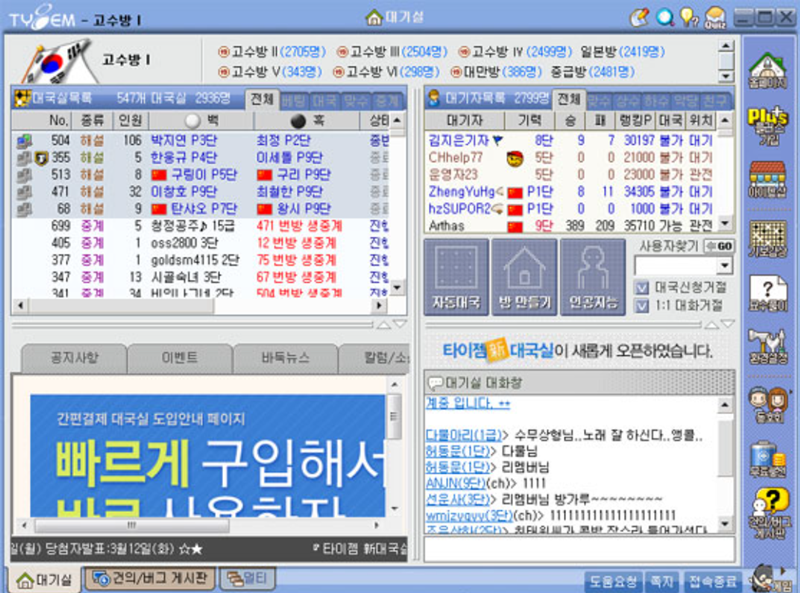 5. 로그인을 마치면 여러 대국방과 다른 이용자들을 볼 수 있는 대기실로 들어서게 됩니다. 이곳에서 자신과 실력이 비슷한 상대를 찾거나 흥미로운 대국을 관전할 수 있습니다.