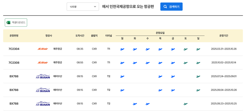 10. 출발 도시를 선택하고 검색하면 해당 노선을 정기적으로 운항하는 항공사 목록이 나옵니다. 운항 편명, 항공사, 도착 시간, 터미널 정보와 함께 요일별 운항 여부 및 운항 기간까지 상세하게 확인할 수 있습니다.