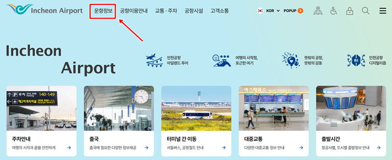 1. 상단 메뉴에서 '운항정보'를 살펴봅니다. 이곳에서는 항공편 검색, 화물 운항 정보, 취항 정보, 공항 혼잡도 등 다양한 내용을 확인할 수 있으며, 출국과 입국에 필요한 여러 정보도 함께 찾아볼 수 있습니다.