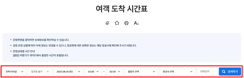 3. '여객 도착 시간표'에서 조회하고 싶은 항공편의 상세 조건을 설정합니다. 전체 터미널, 입국장 출구, 날짜와 시간, 출발지, 항공사를 차례대로 지정한 후 '검색하기'를 누르면 원하는 결과만 간추려서 볼 수 있습니다.