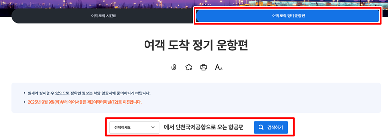 9. '여객 도착 시간표' 옆에 있는 '여객 도착 정기 운항편'을 통해 주기적으로 운항하는 항공편 정보를 찾아볼 수 있습니다. 특정 도시에서 인천국제공항으로 오는 정기 항공편이 궁금할 때 이 메뉴를 활용하면 됩니다.