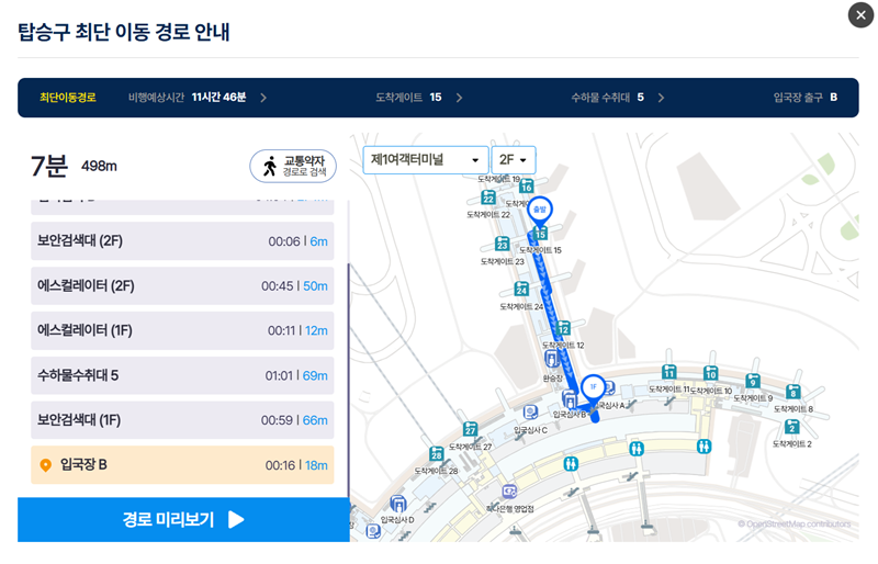 6. '경로보기'를 통해 비행기에서 내린 후 입국장까지의 최단 이동 경로를 지도로 확인할 수 있습니다. 각 구간별 예상 소요 시간과 거리까지 상세하게 안내되어 있어, 마중 나가는 사람이 동선을 미리 파악하기에 편리합니다.