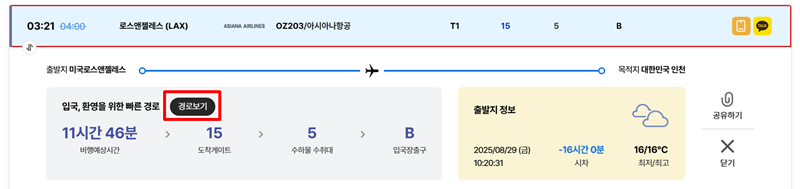 5. 도착편 목록에서 더 자세한 내용을 알고 싶은 특정 항공편을 선택합니다. 그러면 해당 비행기의 예상 비행시간, 도착 게이트, 수하물 수취대, 입국장 출구 정보와 함께 '경로보기'라는 항목이 나타납니다.