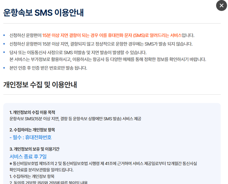 7. 운항 속보 SMS 이용에 관한 안내를 확인할 수 있습니다. 신청한 항공편이 15분 이상 지연되거나 결항될 경우, 그 사유를 휴대폰 문자로 알려주는 서비스입니다. 개인정보 수집 및 이용에 동의해야 하며, 서비스 종료 후 7일간 정보를 보유합니다.