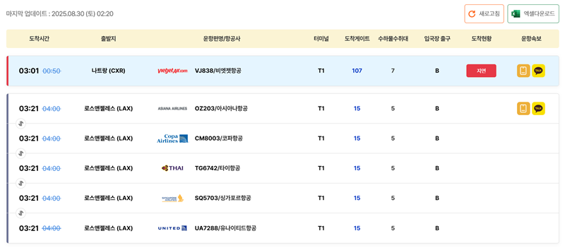 4. 검색 조건에 맞는 항공편 목록이 나타납니다. 예정된 도착 시간과 변경된 시간, 출발지, 운항 편명, 터미널, 수하물 수취대, 입국장 출구, 그리고 현재 비행 상태까지 한눈에 파악할 수 있어 매우 유용합니다.
