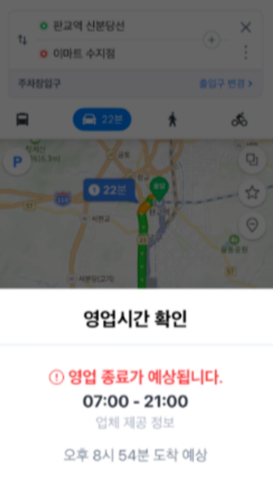 4. 경로 안내를 시작하기 전, 목적지의 운영 시간을 미리 알려주는 세심한 기능도 갖추고 있습니다. 만약 예상 도착 시간이 목적지의 영업 종료 시간과 맞물릴 경우, '영업 종료가 예상됩니다'라는 안내 문구를 보여주어 사용자가 미리 인지하고 계획을 조정할 수 있도록 돕습니다.