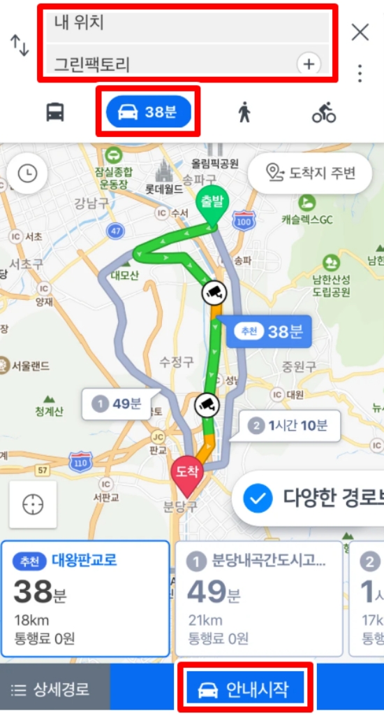 3. 내비게이션 화면으로 전환되면 출발지와 목적지를 입력하는 공간이 보입니다. 목적지 칸에 원하는 장소의 이름이나 주소를 입력하면 관련 장소들이 나타나고, 그중 하나를 선택하면 됩니다. 그러면 자동차 기준으로 예상 소요 시간과 함께 경로 안내를 시작할 수 있는 항목이 활성화됩니다.