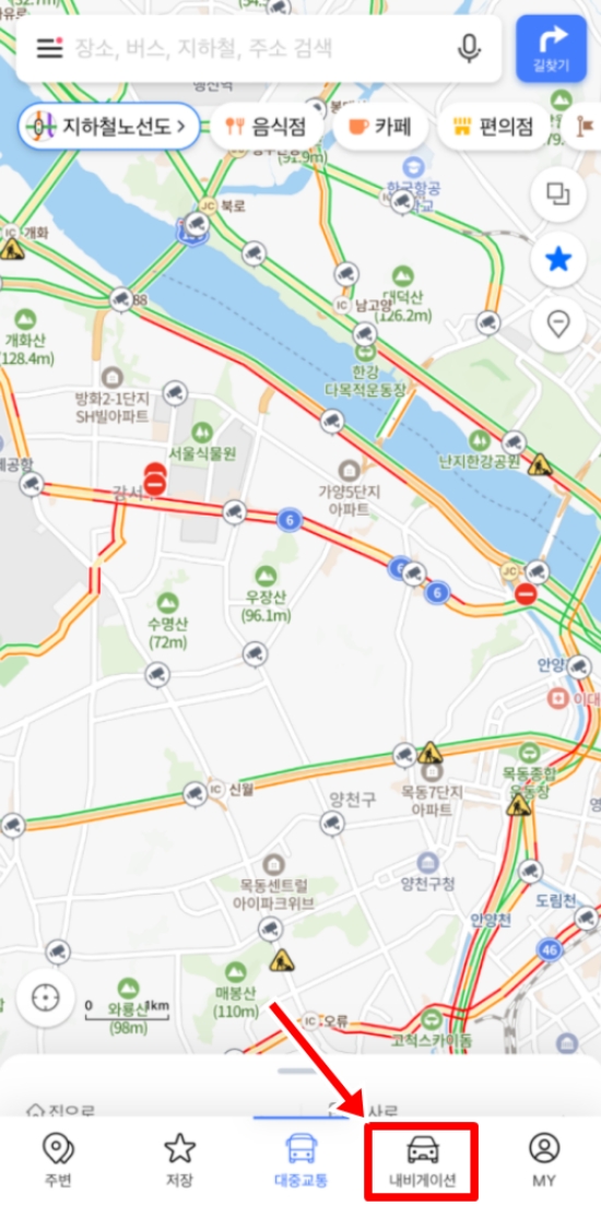 2. 앱을 처음 실행하면 현재 위치를 중심으로 한 지도가 나타납니다. 여기서 길 안내 기능을 사용하려면 화면 하단에 있는 여러 목록 중 '내비게이션'이라고 표시된 부분을 선택해야 합니다. 이곳을 통해 본격적으로 목적지 검색 및 경로 안내를 받을 수 있는 화면으로 이동하게 됩니다.