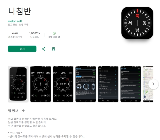5. 선택한 프로그램의 상세 화면으로 이동하면 '설치'라고 적힌 녹색 부분을 발견할 수 있습니다. 이 부분을 눌러주면 별다른 과정 없이 자동으로 스마트폰에 해당 기능이 추가되기 시작합니다. 설치가 진행되는 동안 잠시만 기다려주시면 곧바로 스마트폰에서 나침반을 활용할 수 있게 됩니다.