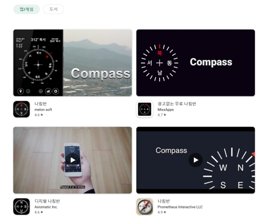 4. 검색을 마치면 화면에 다양한 종류의 나침반 프로그램 목록이 나타납니다. 각 항목마다 별점이나 후기 같은 정보들이 간략하게 표시되어 있어 선택에 도움을 줍니다. 마음에 드는 것을 고르거나, 가장 상단에 보이는 것을 선택하여 다음 단계로 넘어가면 설치 준비가 거의 마무리됩니다.