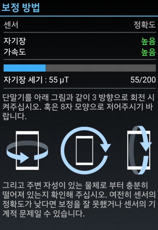 7. 만약 방향이 정확하지 않다고 느껴진다면 보정 기능을 활용해 보세요. 설명에 따라 스마트폰을 8자 모양으로 천천히 여러 번 흔들어주면 센서의 정확도가 높아집니다. 주변에 자성이 강한 물체가 있다면 잠시 멀리하고 시도하는 것이 좋습니다. 이렇게 하면 언제나 정확한 방향을 안내받을 수 있습니다.