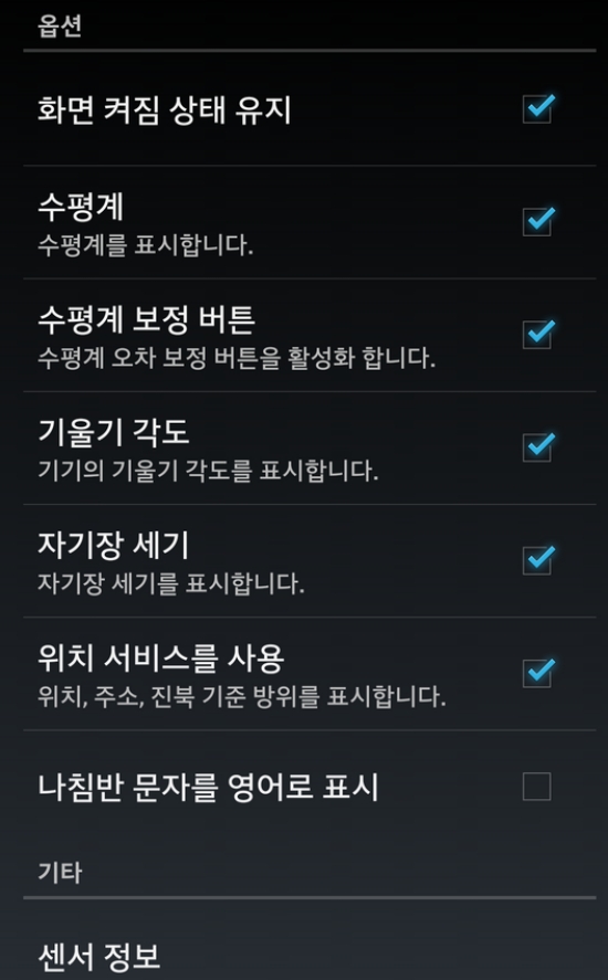 8. 설정 화면에서는 여러 가지 편리한 기능들을 켜고 끌 수 있습니다. 예를 들어, 화면이 계속 켜져 있도록 하거나, 수평계나 기울기 각도를 함께 표시하여 더 많은 정보를 얻을 수도 있습니다. 또한, 필요하다면 나침반에 표시되는 글자를 영어로 바꾸는 등 개인에게 맞게 변경하여 활용할 수 있습니다.