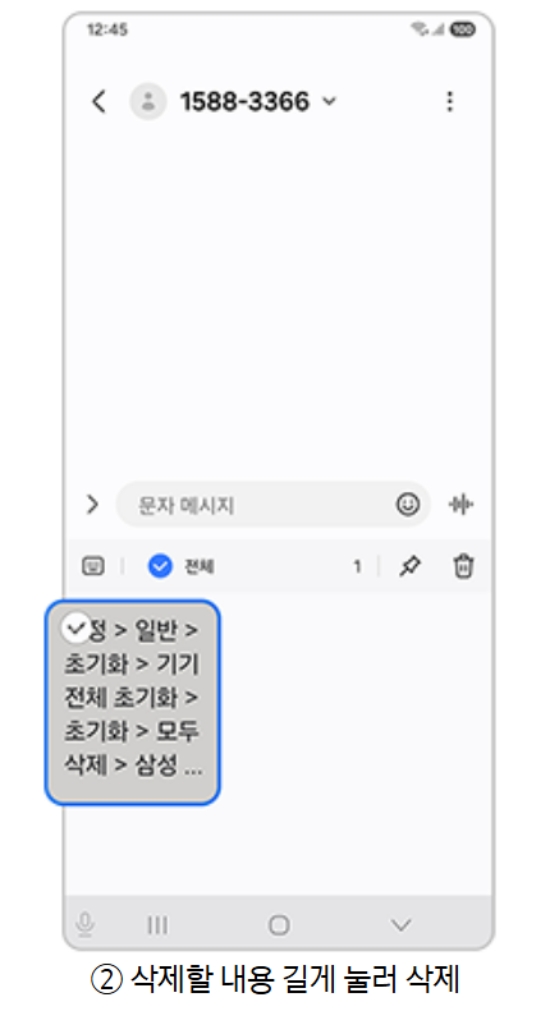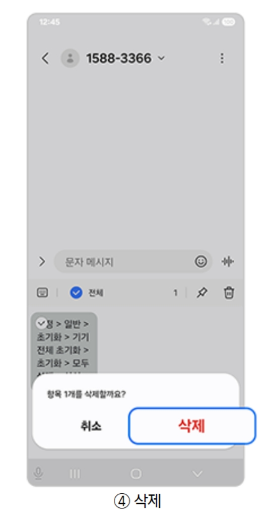 8. 모든 항목을 선택한 후, 마찬가지로 화면 아래의 '삭제'를 눌러주면 저장되어 있던 모든 내용이 지워집니다. 이렇게 하면 개인적인 정보가 스마트폰에 남아있는 것을 방지할 수 있어 안심하고 기기를 사용할 수 있습니다.