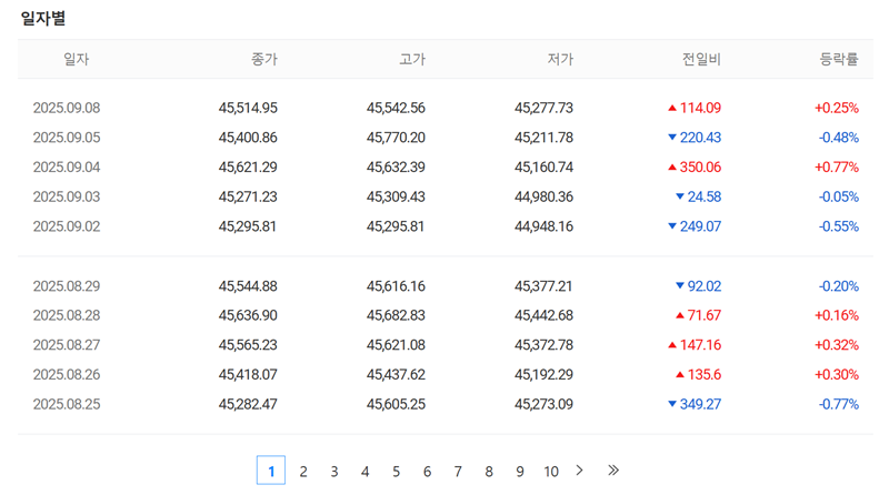 4. 일자별 상세 시세표에서는 과거의 데이터를 날짜순으로 조회할 수 있습니다. 종가, 고가, 저가, 그리고 전일 대비 변동폭과 등락률이 표로 깔끔하게 정리되어 있어, 특정 기간의 주가 추이를 분석하거나 과거 기록을 찾아볼 때 유용하게 활용할 수 있습니다.